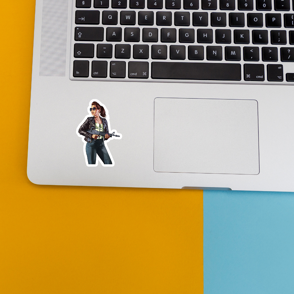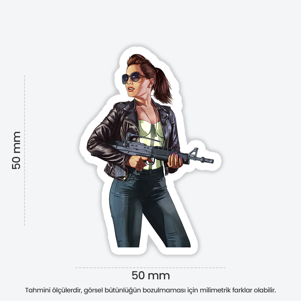 Grand Theft Auto V Brunette Gun Girl Sticker temalı bu eğlenceli sticker, defter, laptop, tablet ve telefon yüzeylerine kolayca yapışır. Suya ve güneşe dayanıklı, çıkartıldığında iz bırakmaz. Ensticker kalitesiyle, dekoratif ve kaliteli sticker arayanlar için ideal seçim.